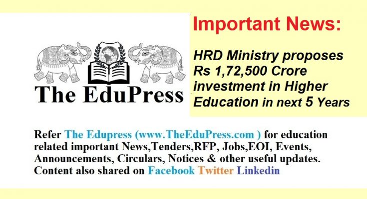 New Delhi : The Ministry of Human Resource Development (MHRD) is proposing an additional investment of Rs 1,72,490 crore in higher education in the next five years, seeking to achieve a quantum leap both in terms of quality and access.