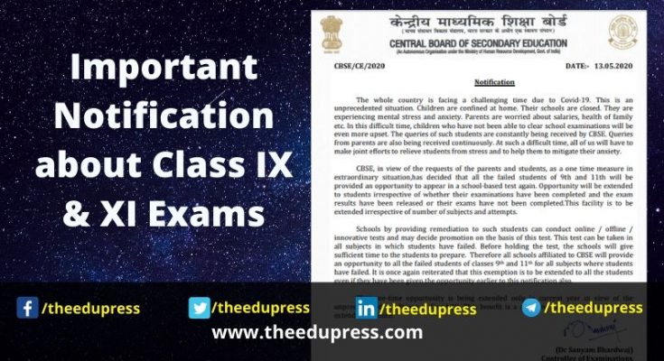 In view of the unprecedented circumstances of Covid-19, Union Minister for Human Resource Development Shri Ramesh Pokhriya ‘Nishank‘ advised CBSE to provide an opportunity to all students, who have failed in 9th and 11th to take online/offline tests. Accordingly, CBSE has issued a notification regarding this.