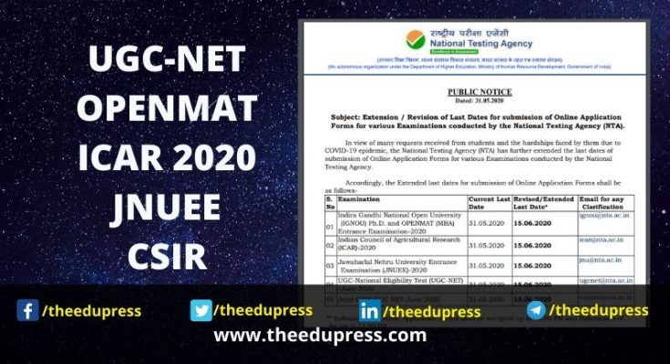 National Testing Agency has further extended the deadline to apply for UGC NET and other examinations including ICAR, CSIR- NET, JNUEE and IGNOU Open MAT till June 15 in view of hardships faced by applicants in filling the application forms during Covid- 19 lockdown.